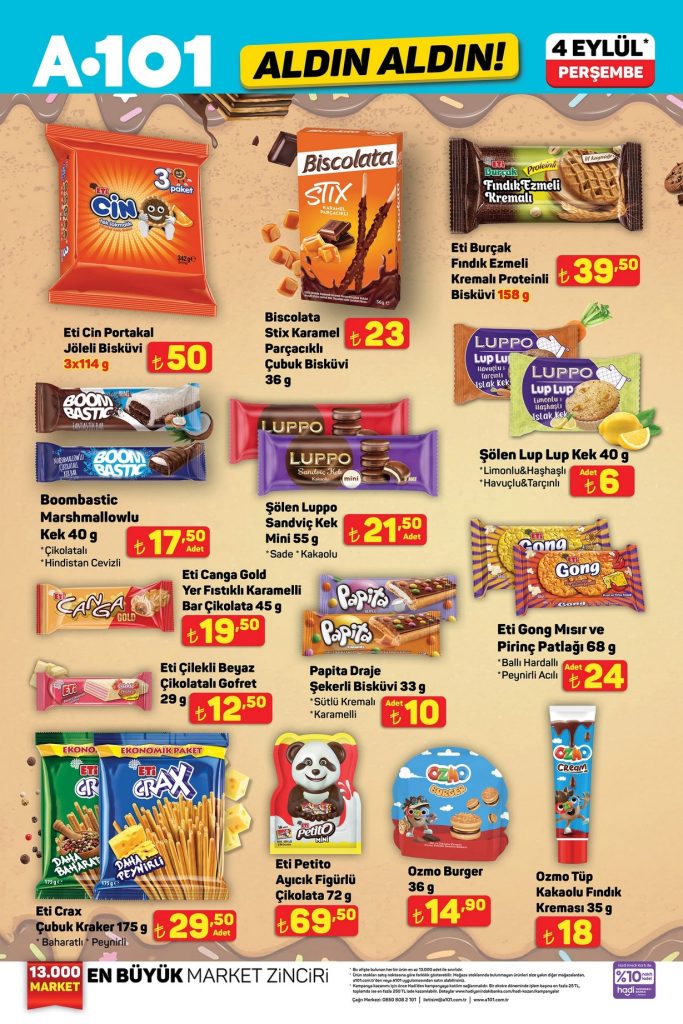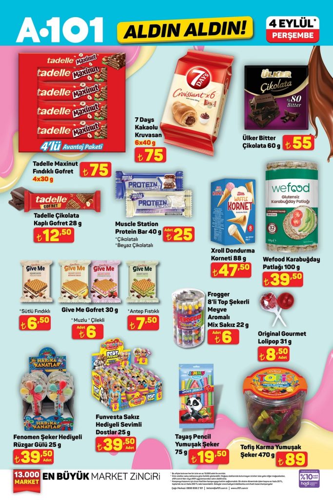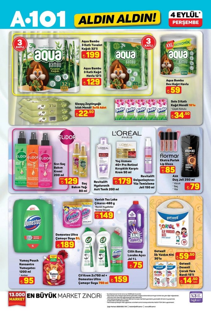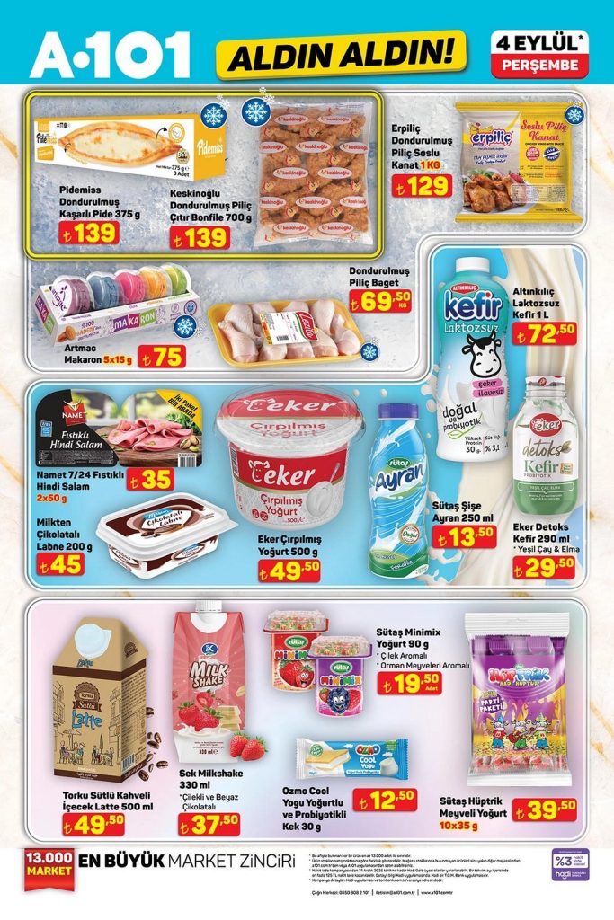 A101 Aldın Aldın aktüel ürünler kataloğu 04 Eylül – 10 Eylül 2025 tarihleri arasında geçerlidir. 14 sayfalık A101 broşüründe gıda, temizlik, elektronik, TV, mutfak ürünleri ve beyaz eşyadan onlarca üründe kampanyalı fiyatlar sizi bekliyor. Güncel A101 indirimlerini ve fırsatlarını kaçırmayın!