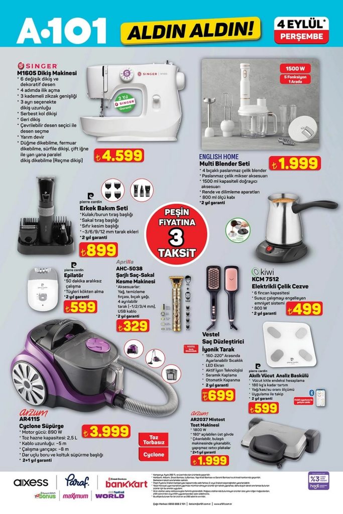 A101 4 Eylül Aldın Aldın indirimleri başlıyor! Buzdolabı, çamaşır makinesi, televizyon, mutfak aletleri, gıda ürünleri ve daha fazlasında cazip fiyatlar! Hemen keşfet, fırsatları kaçırma!