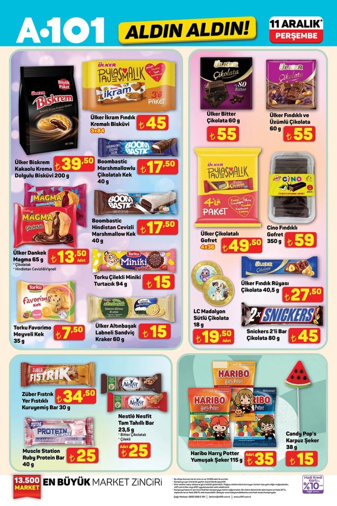 A101 Aldın Aldın aktüel ürünler kataloğu 11-17 Aralık tarihleri arasında geçerlidir. 15 sayfalık A101 broşüründe gıda, temizlik, elektronik, TV, mutfak ürünleri, oyuncaklar, tekstil ve elektrikli taşıtlardan onlarca üründe kampanyalı fiyatlar sizi bekliyor. Güncel A101 indirimlerini ve fırsatlarını kaçırmayın!