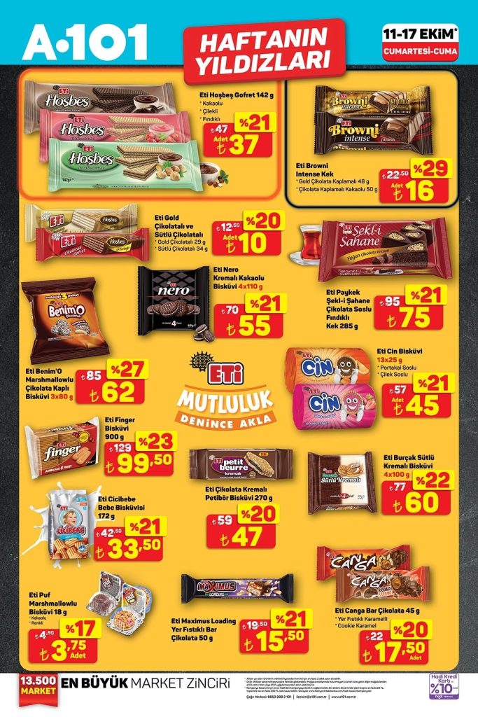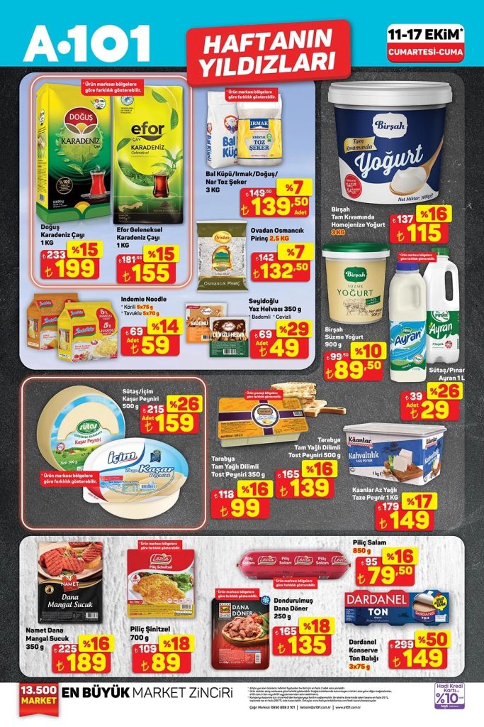 A101 Haftanın Yıldızları aktüel ürünler kataloğu 11 Ekim– 17 Ekim 2025 tarihleri arasında geçerlidir. A101 broşürü 7 sayfadan oluşmaktadır. Bu haftaki katalog gıda ve temizlik ürünleri ağırlıklı.