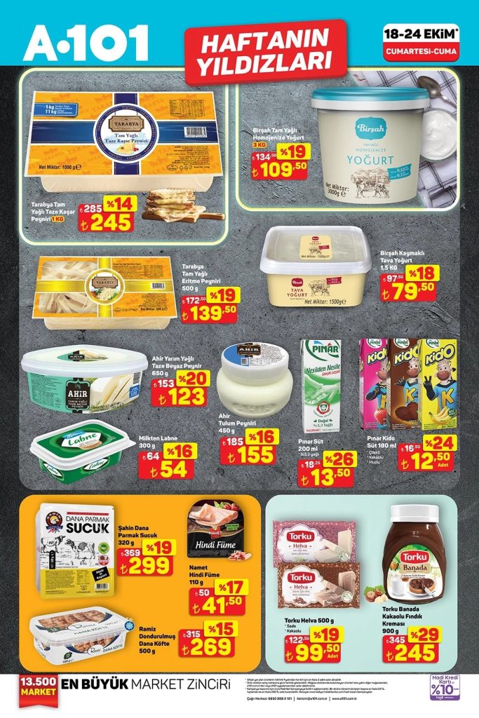 A101 Haftanın Yıldızları aktüel ürünler kataloğu 18 Ekim–24 Ekim 2025 tarihleri arasında geçerlidir. A101 broşürü 5 sayfadan oluşmaktadır. Bu haftaki katalog gıda ve kişisel bakım ürünleri ağırlıklı.
