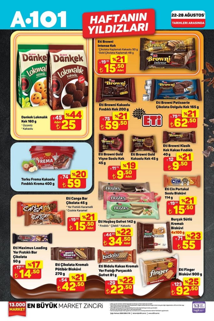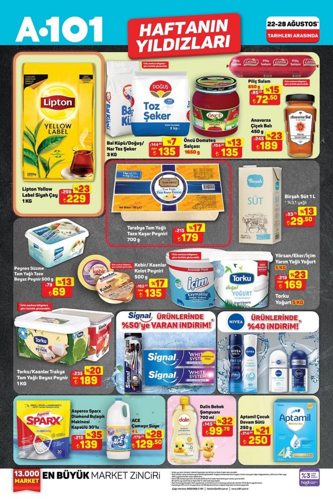 A101 Haftanın Yıldızları aktüel ürünler kataloğu 22-28 Ağustos 2025 tarihleri arasında geçerlidir. A101 broşürü 8 sayfadan oluşmaktadır. Bu haftaki katalog gıda ürünleri ağırlıklı.
