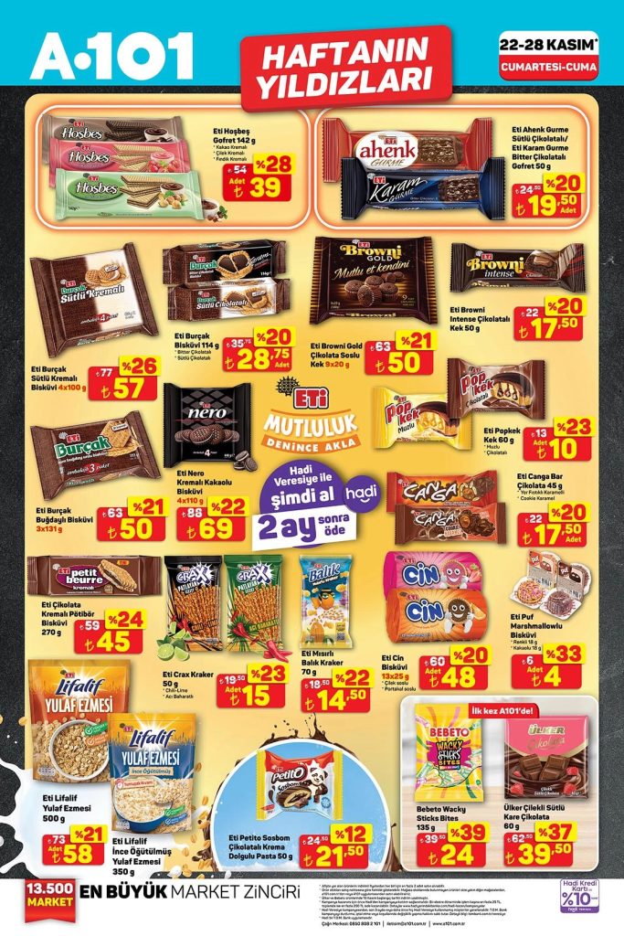 A101 Haftanın Yıldızları aktüel ürünler kataloğu 22-28 Kasım 2025 tarihleri arasında geçerlidir. A101 broşürü 5 sayfadan oluşmaktadır. Bu haftaki katalog gıda ve temizlik ürünleri ağırlıklı