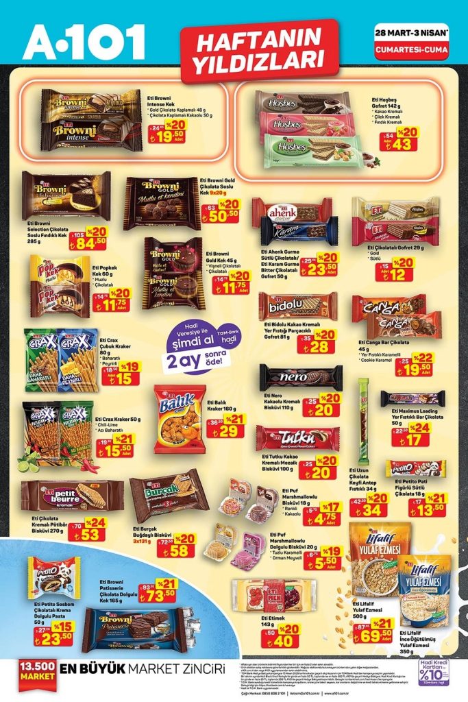 A101 Haftanın Yıldızları aktüel ürünler kataloğu 28 Mart – 3 Nisan 2026 tarihleri arasında geçerlidir. A101 broşürü 7 sayfadan oluşmaktadır. Bu haftaki katalog gıda ve temizlik ürünleri ağırlıklı.