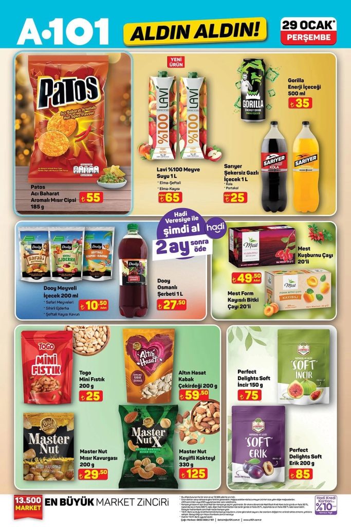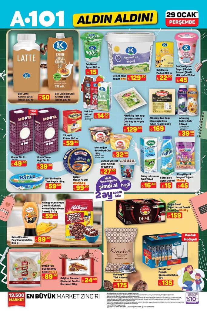 A101 Aldın Aldın aktüel ürünler kataloğu 29 Ocak – 04 Şubat 2026 tarihleri arasında geçerlidir. 16 sayfalık A101 broşüründe gıda, temizlik, elektronik, TV, mutfak ürünleri, oyuncaklar, yapı market ürünleri ve elektrikli taşıtlardan onlarca üründe kampanyalı fiyatlar sizi bekliyor. Güncel A101 indirimlerini ve fırsatlarını kaçırmayın!