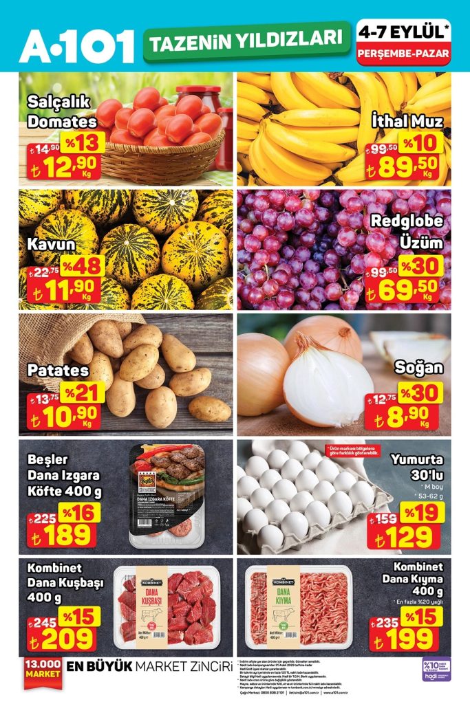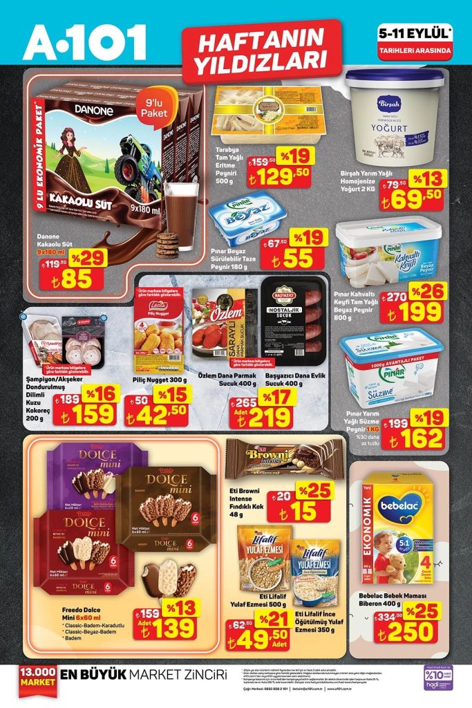 A101 market zincirinin 5-11 Eylül tarihleri arasındaki haftanın yıldızları kampanyası, geniş bir ürün yelpazesinde indirimler sunuyor. Bu kampanyada süt ürünleri, et ve şarküteri, kahvaltılıklar, temizlik ürünleri, bebek maması ve taze meyve-sebze gibi kategorilerde uygun fiyatlar dikkat çekiyor.