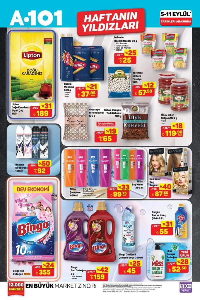 A101 Haftanın Yıldızları aktüel ürünler kataloğu 5 Eylül – 11 Eylül 2025 tarihleri arasında geçerlidir. A101 broşürü 4 sayfadan oluşmaktadır. Bu haftaki katalog gıda ve temizlik ürünleri ağırlıklı.