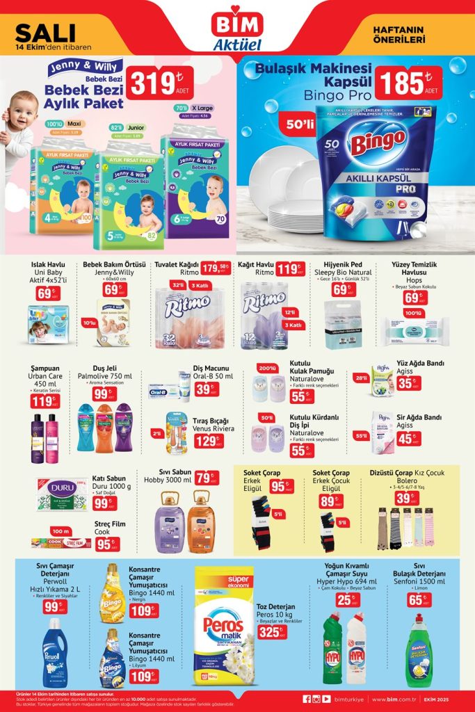 BİM Salı Aktüel 14-20 Ekim 2025 indirimleri başladı! Bebek bezi, hijyenik ped, bulaşık deterjanı, şampuan, sabun, yoğurt, süt, peynir, kahvaltı bisküvileri, çikolata, kahve ve temizlik ürünleri gibi günlük ihtiyaçlarda %30’a varan fırsatlar. Jenny & Willy, Bingo, Ritto, Feast, Ülker ve daha fazlası stoklarda! Hemen BİM mağazalarına gelin, bütçenizi koruyun.
