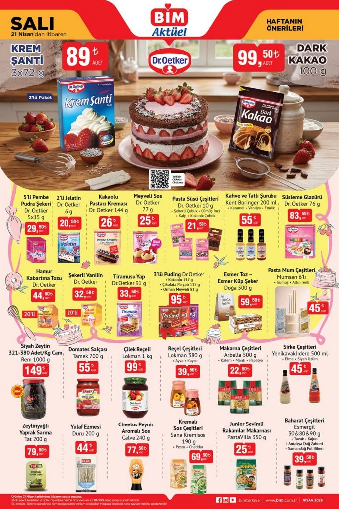 BİM 21 Nisan – 27 Nisan aktüel kataloğu yayında! Atıştırmalıklar, çikolatalar, Dr. Oetker pasta malzemeleri, çocuk kozmetik ve bebek bakım ürünlerindeki indirimleri hemen inceleyin.