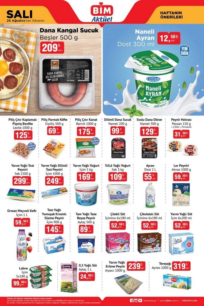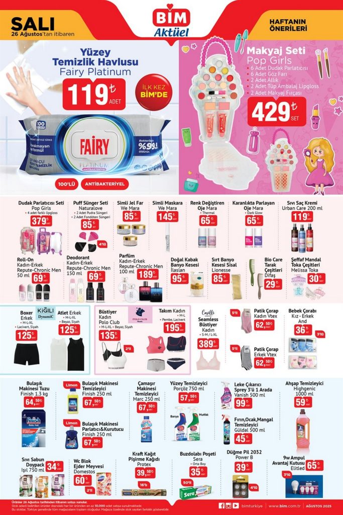 BİM 26 Ağustos Salı Aktüel Ürünler broşürü 3 sayfadan oluşmaktadır. 01 Eylül 2025 tarihine kadar geçerli olacak indirimler, tüm BİM marketlerde geçerlidir. Bu haftaki katalogda; gıdadan temizlik ürünlerine,. giyimden birçok farklı kategoriye kadar geniş bir yelpazede onlarca üründe kampanyalı fiyatlar mevcut.