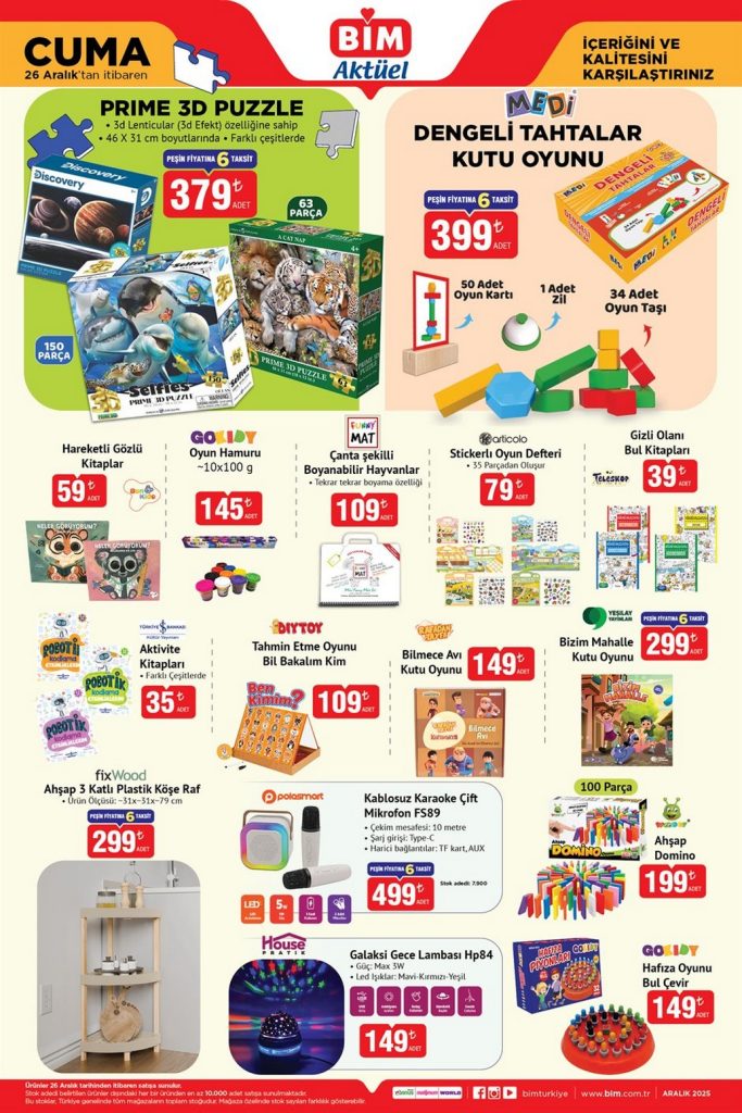 BİM 26 Aralık Cuma Aktüel Ürünler broşürü 6 sayfadan oluşmaktadır. 26 Aralık 2025 -01 Ocak 2026 tarihleri arasında geçerli olacak indirimler tüm BİM marketlerde geçerlidir. Bu haftaki katalogda mutfak eşyalarından, elektronik ürünlere, giyimden, oyuncaklara kadar çok geniş yelpazede ürünler mevcut.