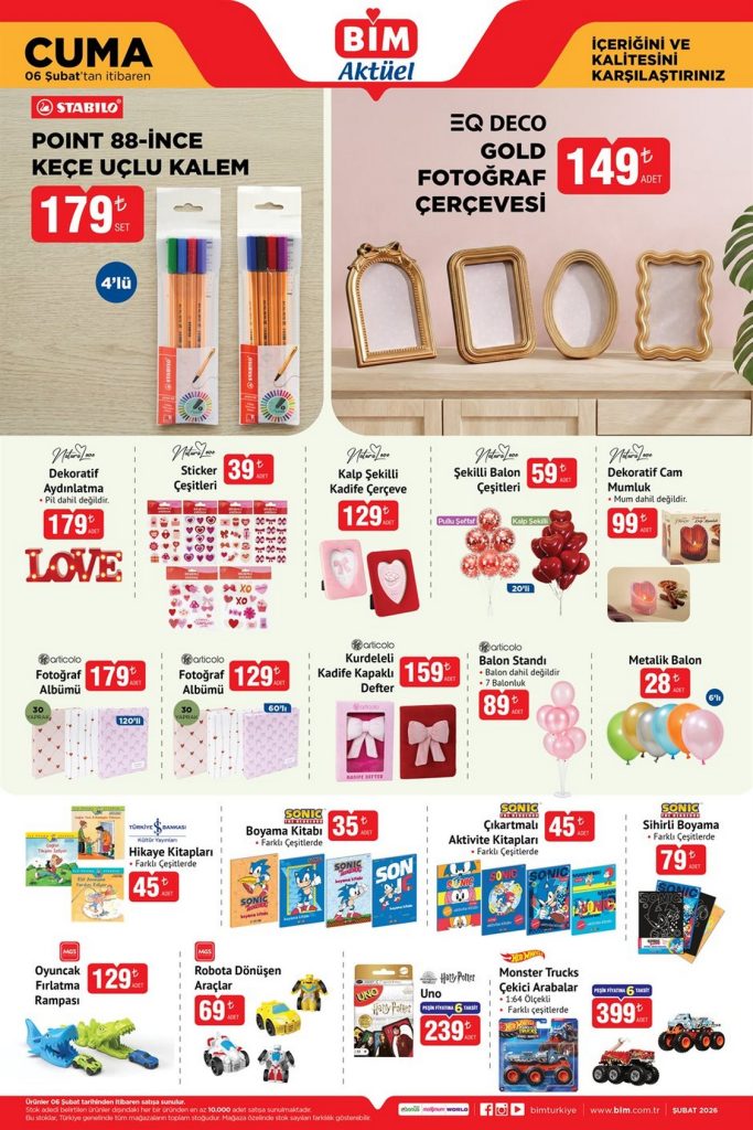 BİM 6 Şubat Cuma Aktüel Ürünler broşürü 6 sayfadan oluşmaktadır. 6 Şubat – 12 Şubat 2026 tarihleri arasında geçerli olacak indirimler tüm BİM marketlerde geçerlidir. Bu haftaki katalogda mutfak eşyalarından, elektronik ürünlere, tekstile kadar çok geniş yelpazede ürünler mevcut.