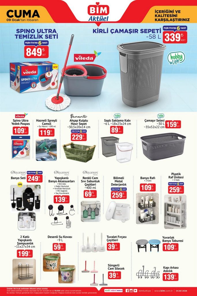 BİM 9 Ocak Cuma Aktüel Ürünler broşürü 6 sayfadan oluşmaktadır. 9 Ocak- 15 Ocak 2026 tarihleri arasında geçerli olacak indirimler tüm BİM marketlerde geçerlidir. Bu haftaki katalogda mutfak eşyalarından, elektronik ürünlere, giyimden, ev tekstiline kadar çok geniş yelpazede ürünler mevcut.