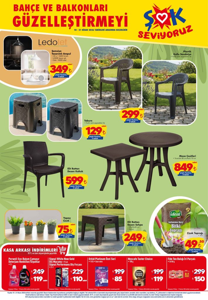 ŞOK 18-21 Nisan 2026 aktüel kataloğunda küçük ev aletleri, kişisel bakım ürünleri ve bahçe mobilyaları indirimde.