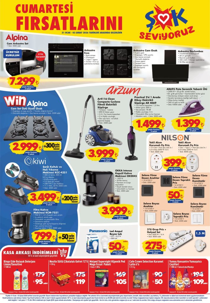 ŞOK 31 Ocak – 3 Şubat 2026 hafta sonu fırsatlarını kaçırmayın! Alpina ankastre set, Arzum süpürge, Kiwi halı yıkama makinesi ve Pritt okul gereçlerinde dev indirimler başladı.